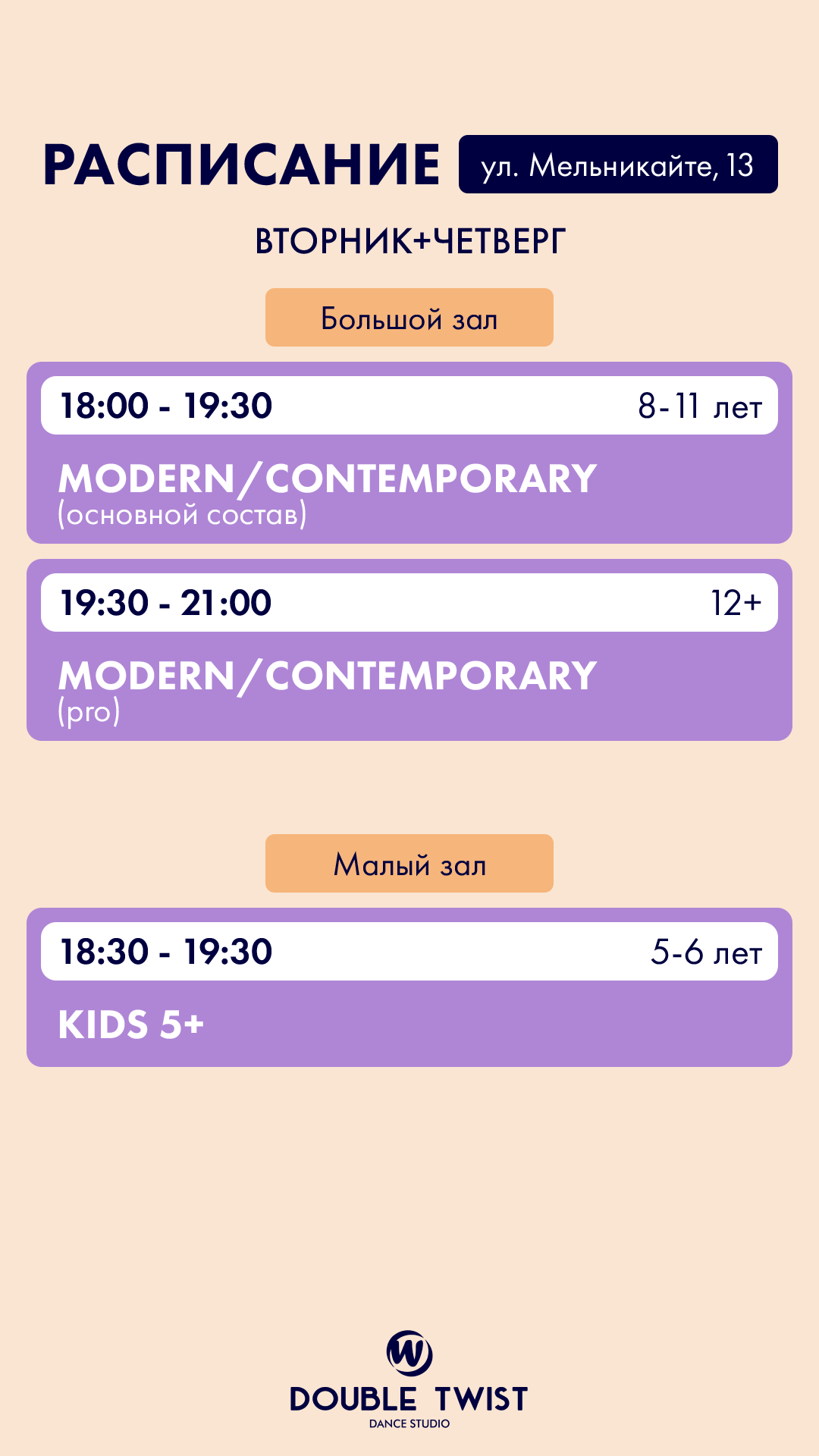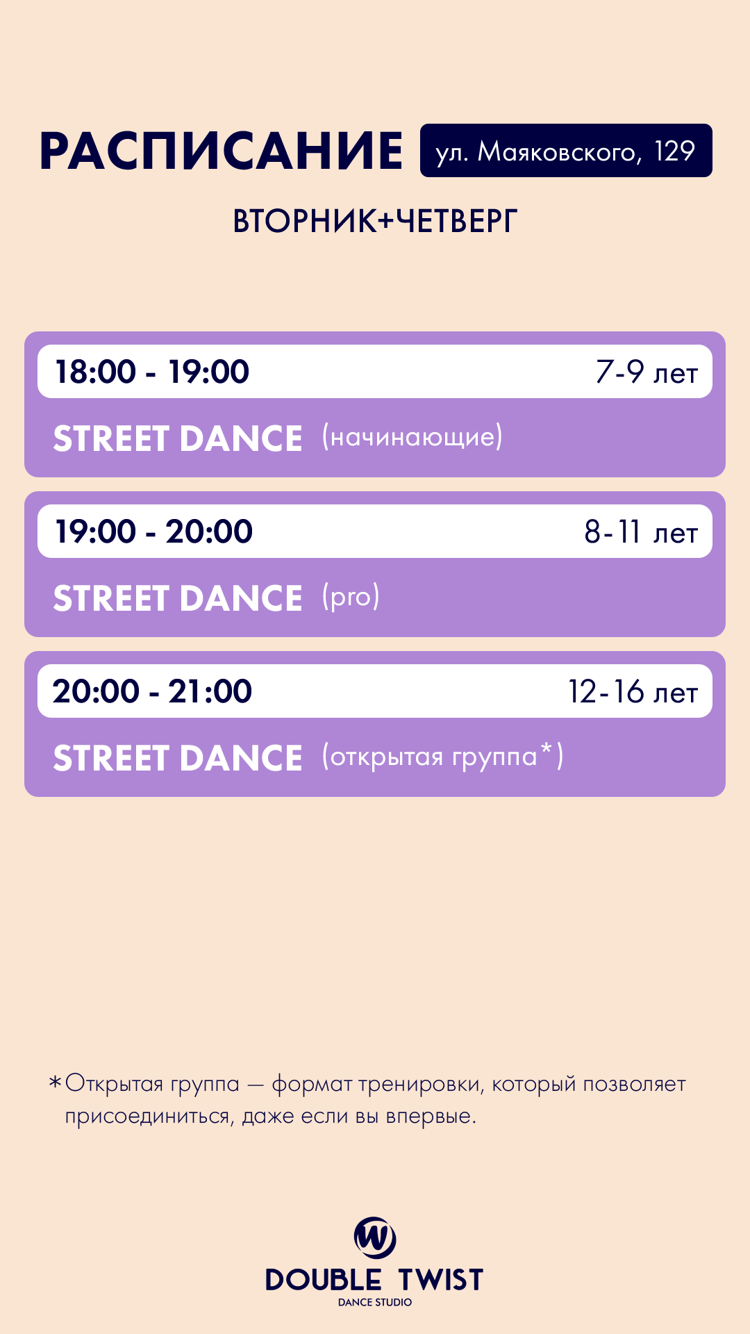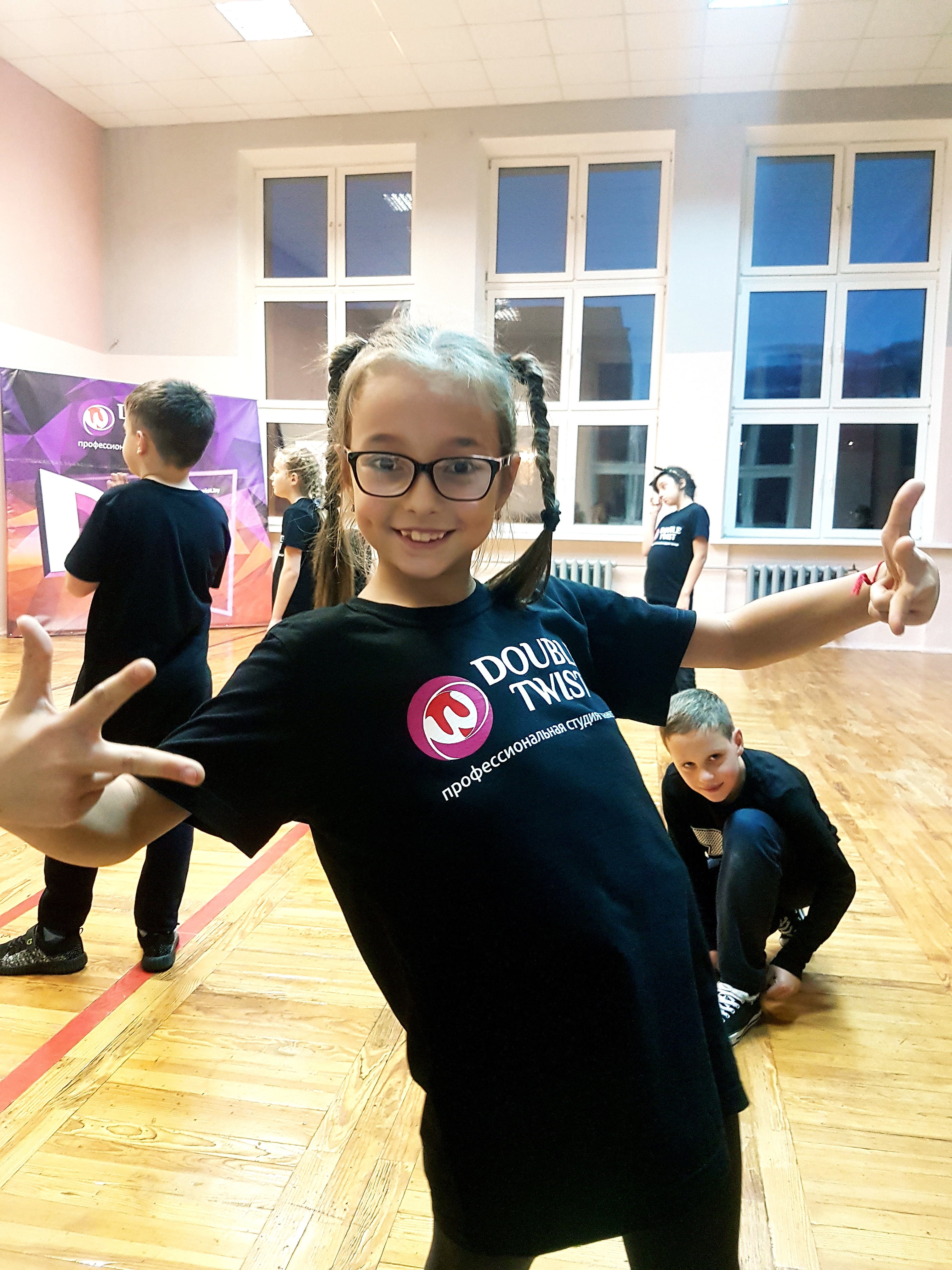 В Double Twist ребёнок не только поймёт, но и увидит, что он не один. Он узнает, что танец – это гораздо больше, чем ритмичные движения под музыку, ощутив всю его энергетику и культуру в процессе обучения. Среди учеников проводятся танцевальные батлы (мини-соревнования), отчетные концерты, подогревая их интерес, мотивируя на результат и работу над собой!"