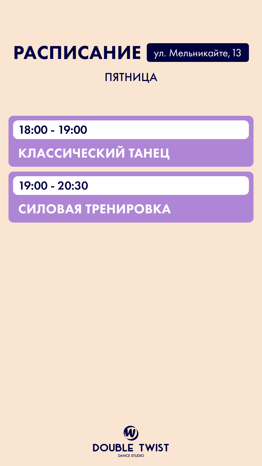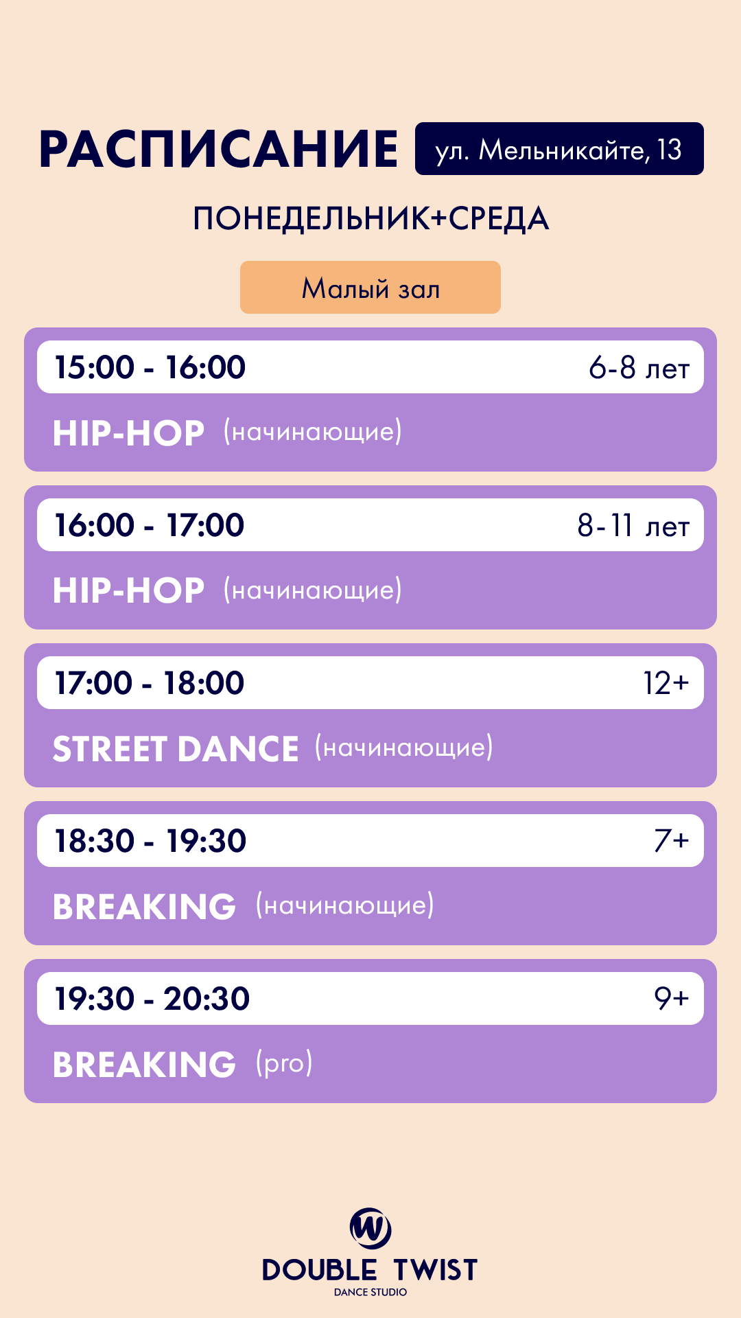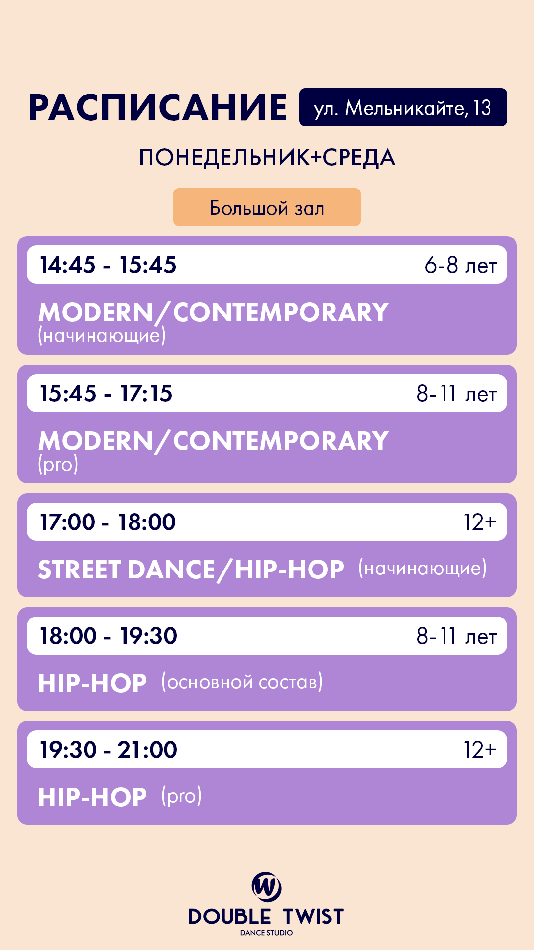 В Double Twist ребёнок не только поймёт, но и увидит, что он не один. Он узнает, что танец – это гораздо больше, чем ритмичные движения под музыку, ощутив всю его энергетику и культуру в процессе обучения. Среди учеников проводятся танцевальные батлы (мини-соревнования), отчетные концерты, подогревая их интерес, мотивируя на результат и работу над собой!"